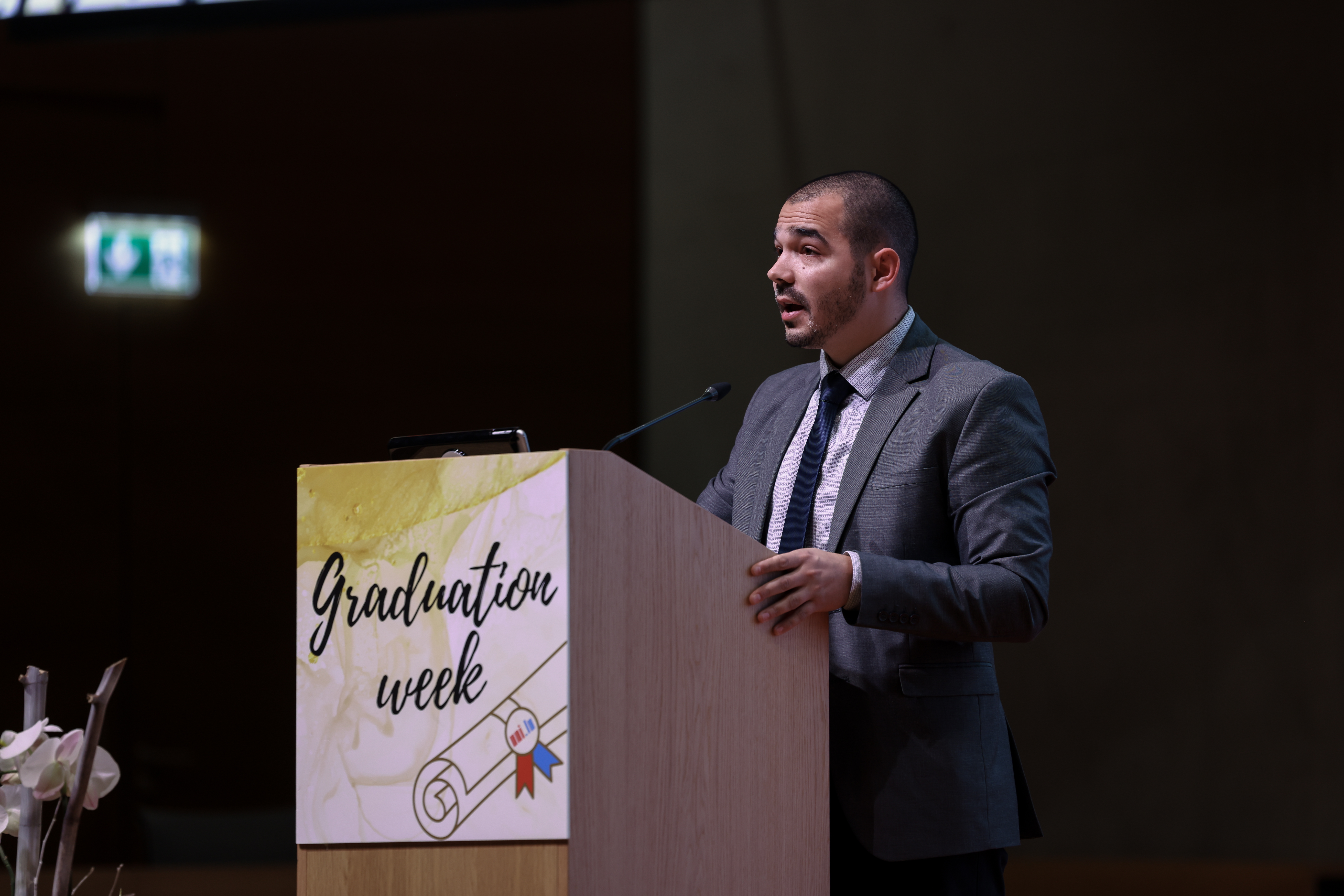 Jordan Samhi smiling at the lectern at the PhD Graduation Day 2023
