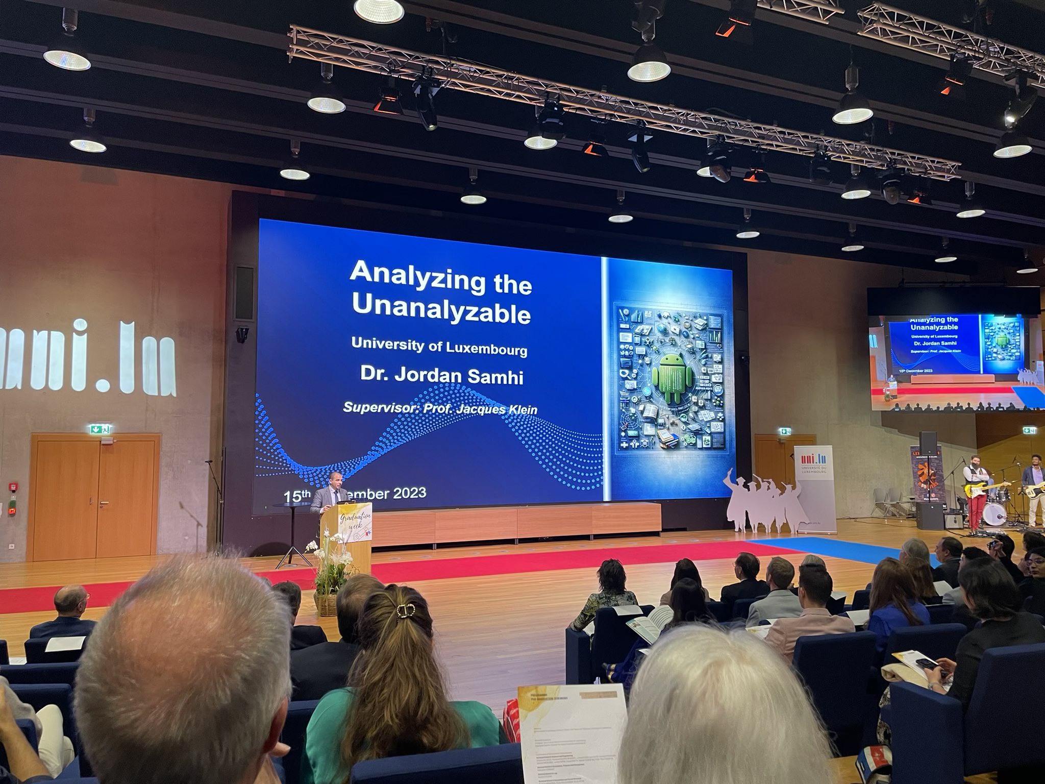 Jordan Samhi giving a talk at the lectern at the PhD Graduation Day 2023 1